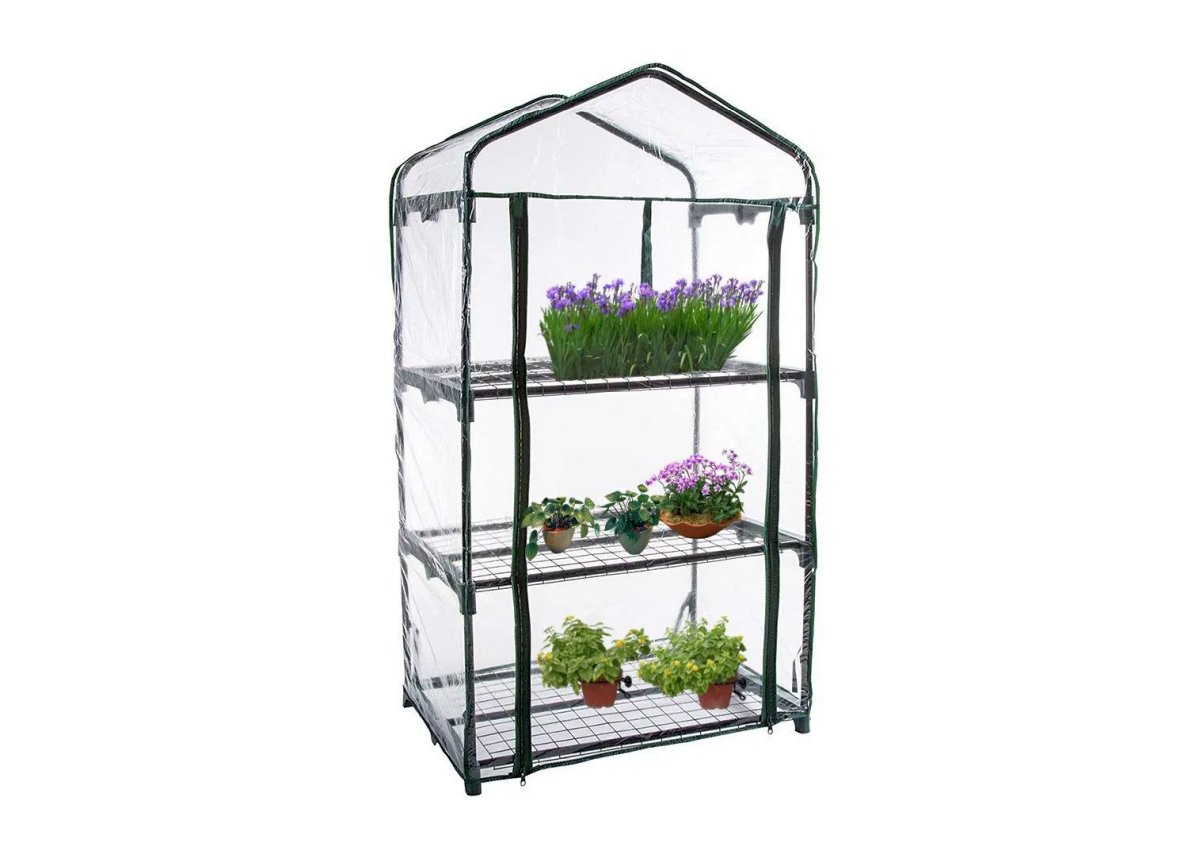 Sen kolme hyllyä tarjoavat kompaktin tilan kasvatukseen: 0,3 m². Teräsrunko pitää kasvit ojennuksessa ja läpikuultava PVC-muovi päästää valon läpi.