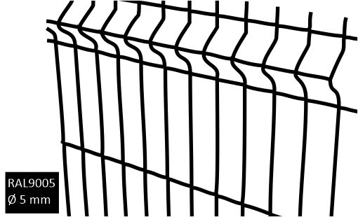 Staketpaneler 3D 5 mm RAL9005 i svart, med horisontella och vertikala trådar sammansvetsade för ökad hållbarhet och styrka. V-förstärkningar är pressade in för att ge extra förstärkning och stabilitet. De vertikala trådarna är placerade 25 mm ovanför den horisontella tråden, vilket gör det svårt för både människor och djur att klättra över.